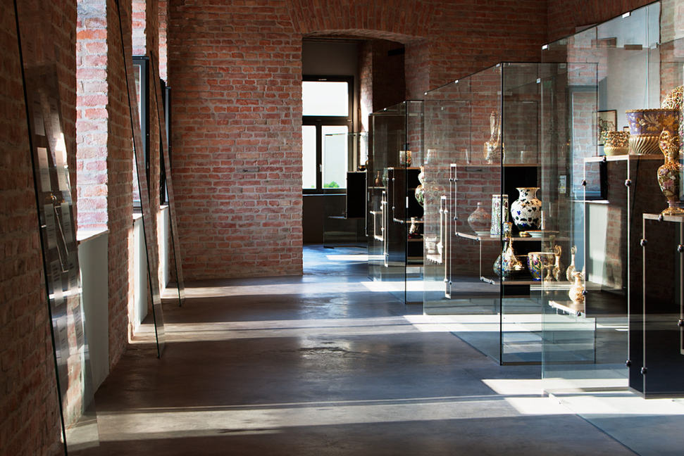 The undulating shelves serving as the foundation of the installation have a dual purpose: showcasing ceramics of various sizes at different heights while reinforcing the glass panels for greater stability.